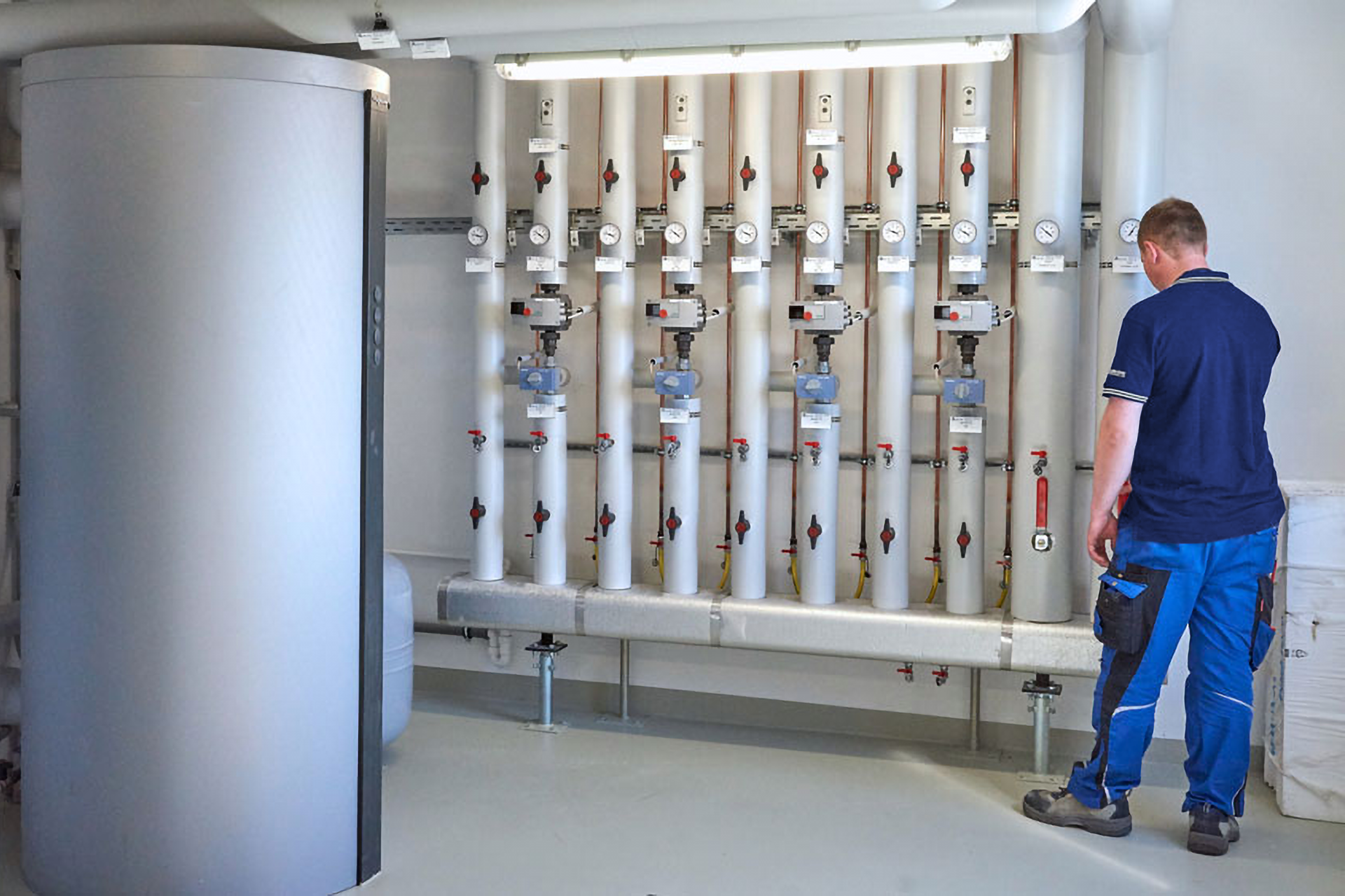 Um das Gebäude der Rudolf Ostermann GmbH möglich kostensparend beheizen zu können, entwickelten wir eine weltweit einmalige Wärmetauscher- Lösung auf CO2-Basis. Dafür funktionierten wir so genannte „Q-tons“ um. Die ursprünglich für die Warmwasseraufbereitung entwickelten Geräte entziehen der Außenluft Wärme und nutzen diese. Unsere Fachleute erkannten das Potenzial der Technologie und bauten daraus eigene Prototypen. In Kombination mit der Stromgewinnung durch Solarmodule entstand eine einmalige Heizungsanlage, die preisgünstig und gleichzeitig umweltneutral arbeitet. Auch im Sanitärbereich war Kreativität gefragt. Grund war die Expansion der Rudolf Ostermann GmbH. Als diese ihre neue Zentrale plante, stand Vereinbarkeit von Familie und Beruf ganz oben auf der Agenda. So entstand unmittelbar neben der Verwaltung die firmeneigene Kindertagesstätte. Beide Gebäude werden über ein gemeinsames Regelsystem mit Wasser versorgt. Was dabei zentral ganz heiß eingespeist wird, kommt an Hähnen und Reglern perfekt temperiert an. Umweltfreundliche Technologien sind dabei ebenso selbstverständlich wie eine optimale Ausnutzung der natürlichen Ressourcen.